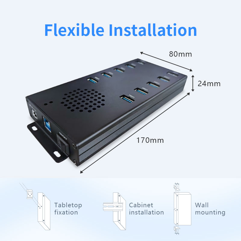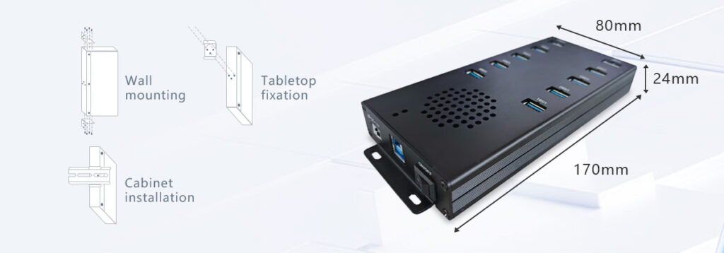 Industrial USB hubs support rail installation, wall-mounting, or desktop installation, making them suitable for scenarios such as factories, cabinets, offices, and vehicle terminals.